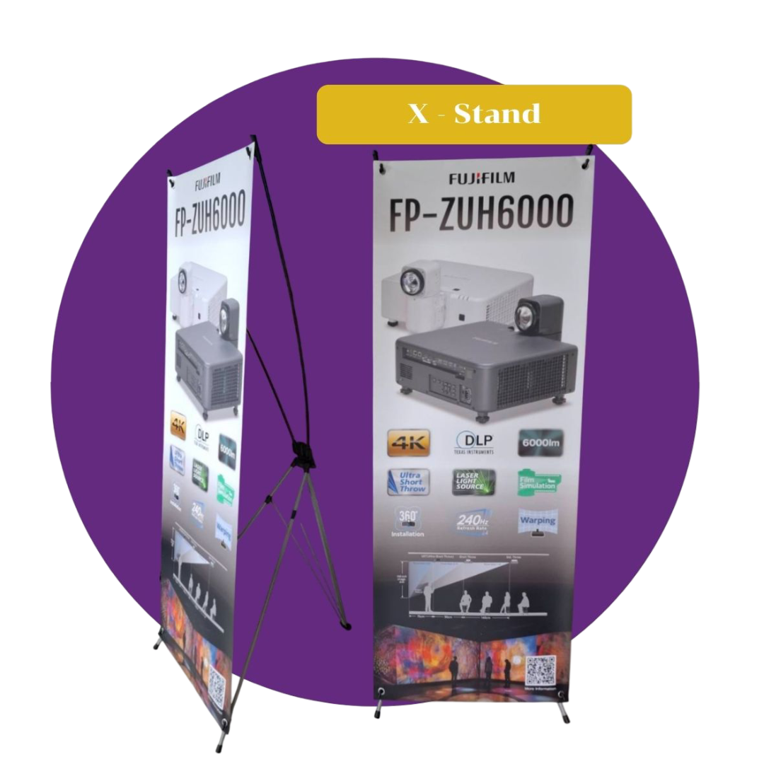 X-Stand คือป้ายตั้งพื้นรูปตัว X โครงสร้างทำจากอลูมิเนียมหรือไฟเบอร์ น้ำหนักเบา พร้อมตะขอเกี่ยว 4 มุมสำหรับแขวนแผ่นภาพโฆษณา (Poster Graphic)