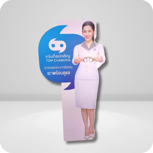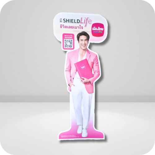 Standee ป้ายสแตนดี้ ทำจาก PP board แข็งแรง หุ้มด้วยสติกเกอร์ พร้อม ได-คัทตามแบบ เหมาะกับการใช้งานหลากหลายรูปแบบ